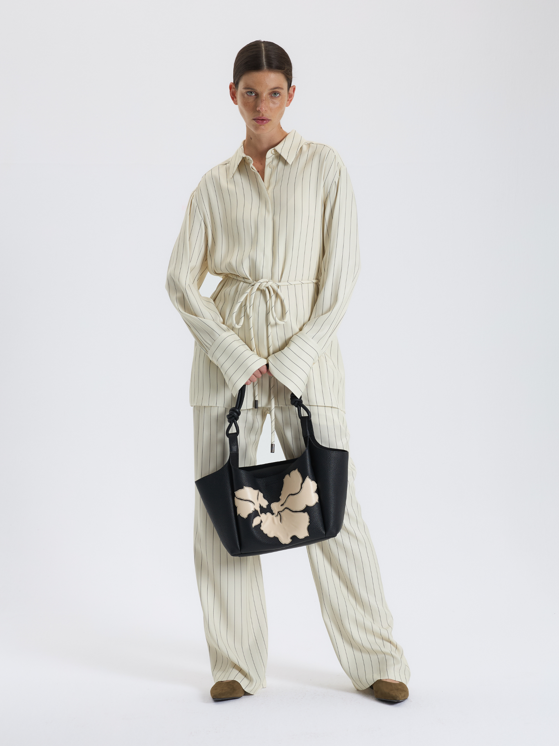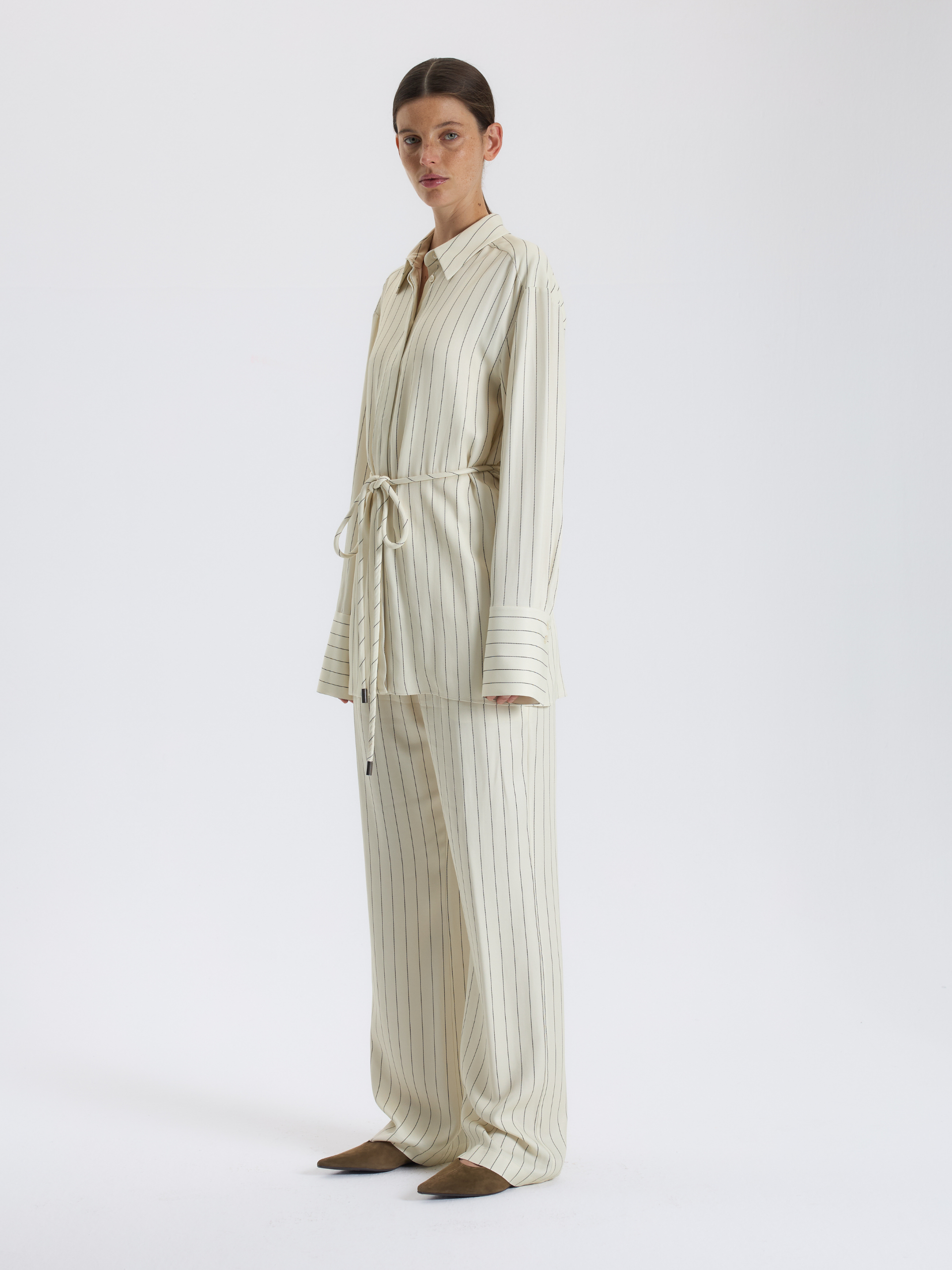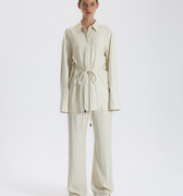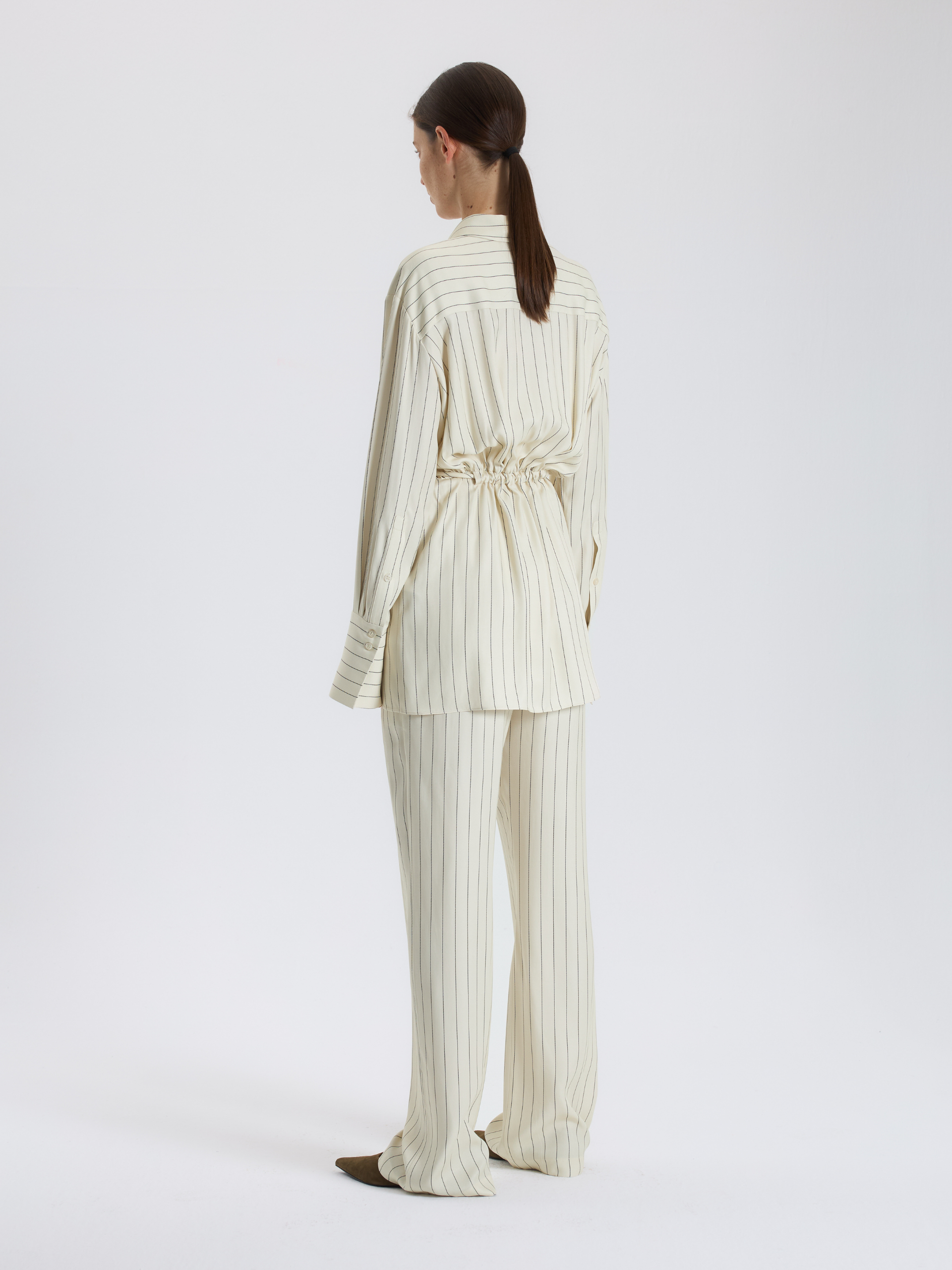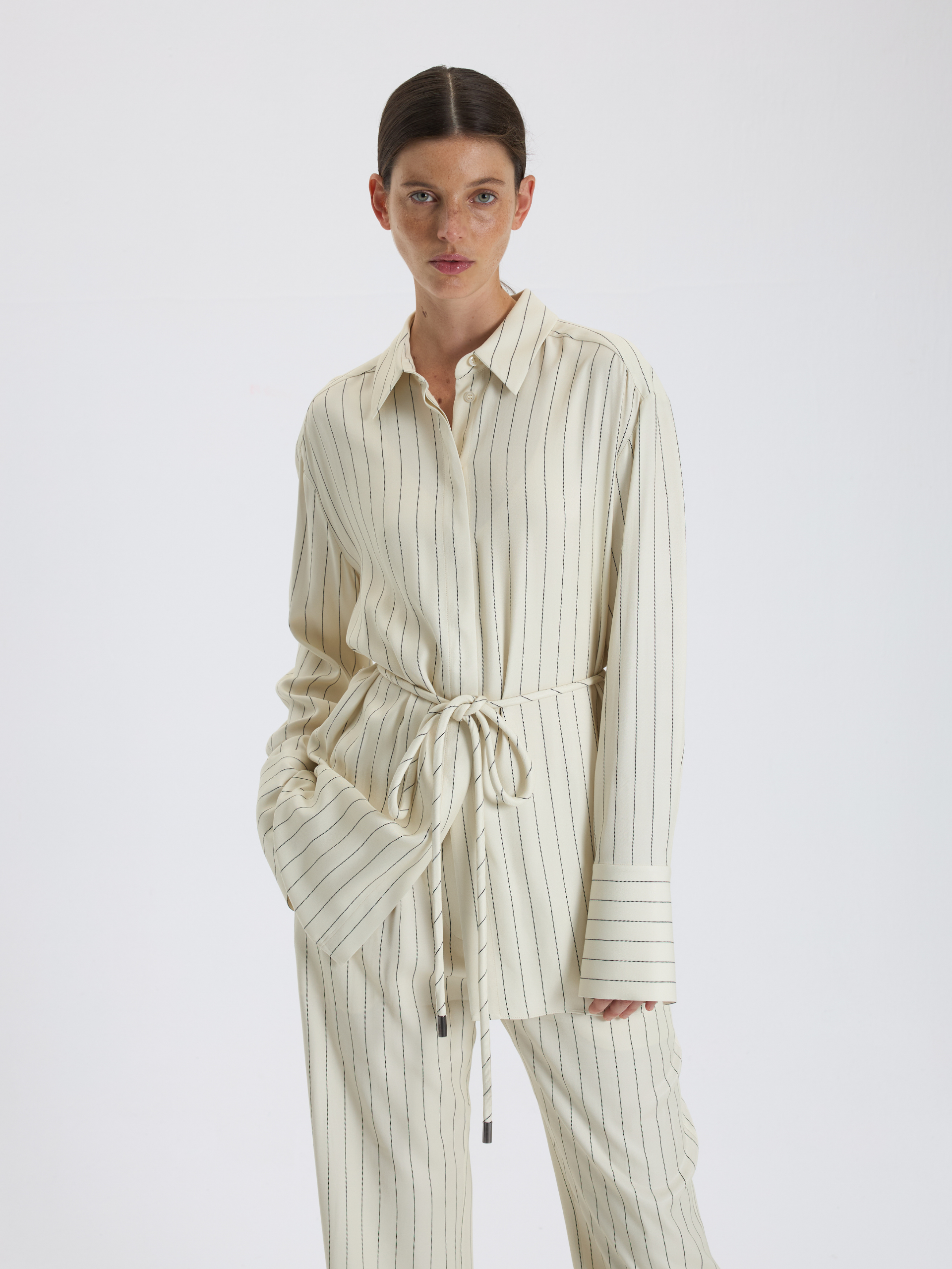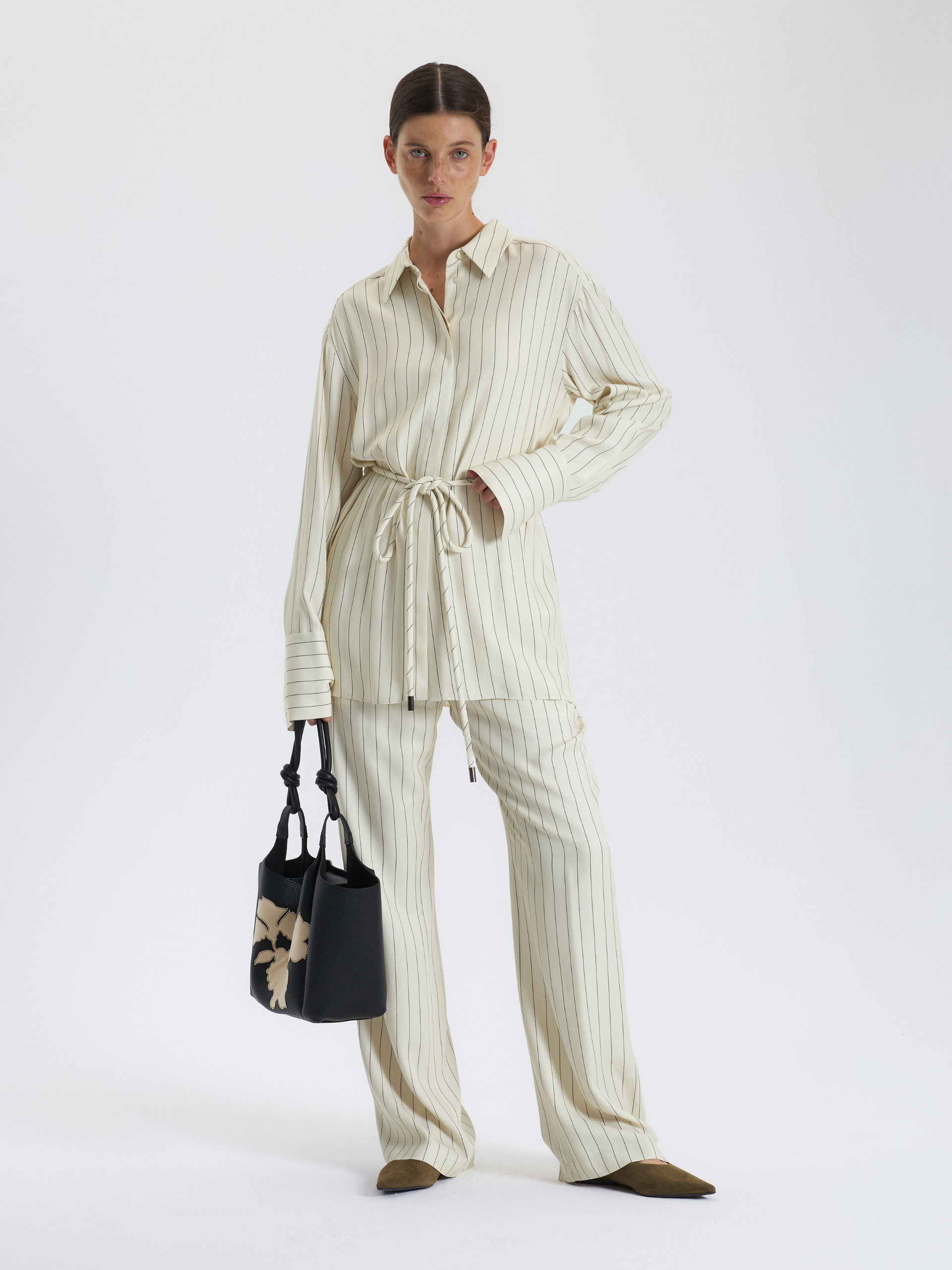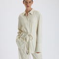 Dikey çizgili tasarımıyla modern görünüm sunan oversize gömleği tüm kombinlerinizle eşleştirebilirsiniz.