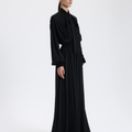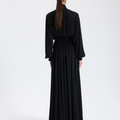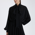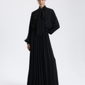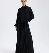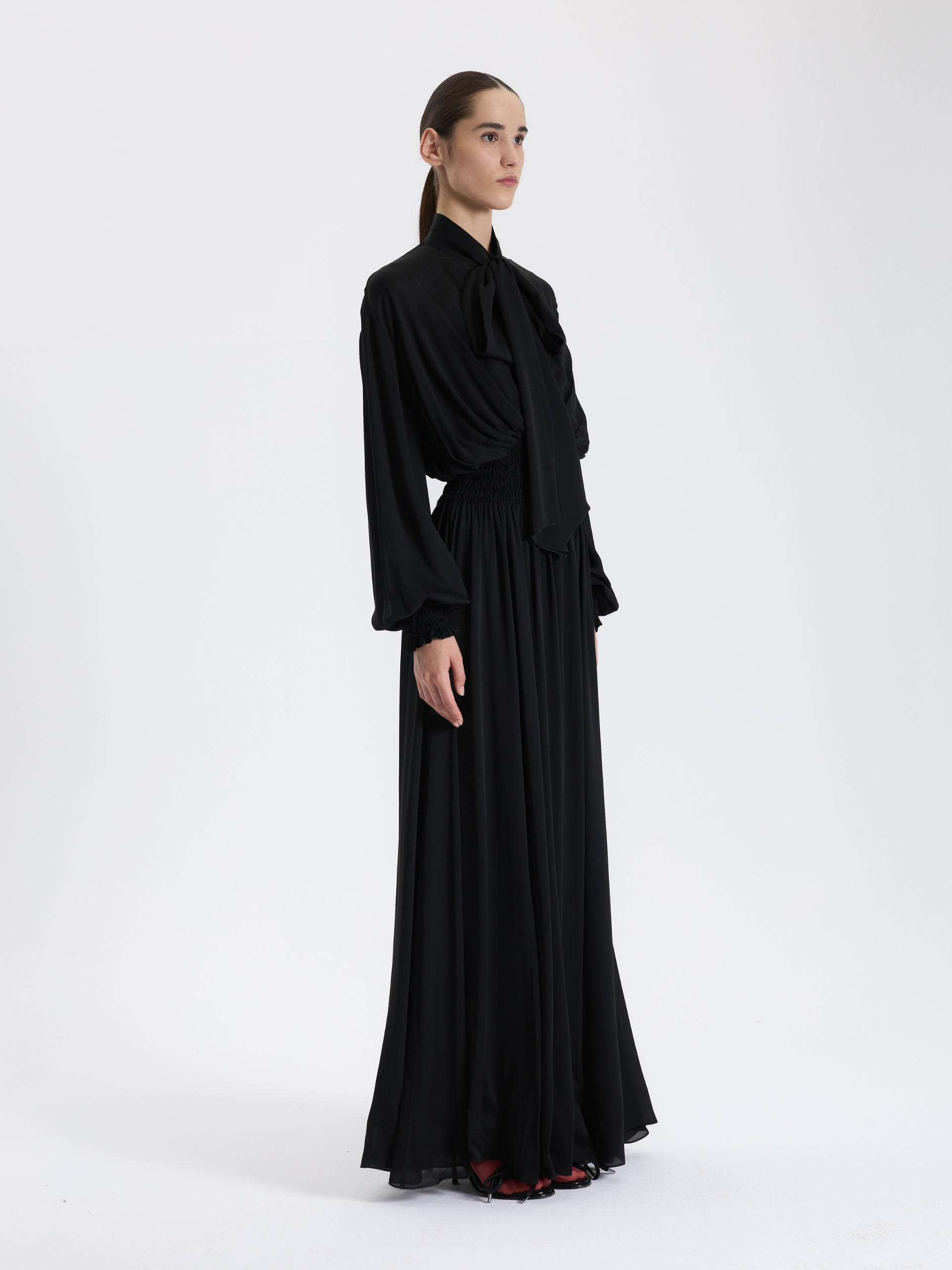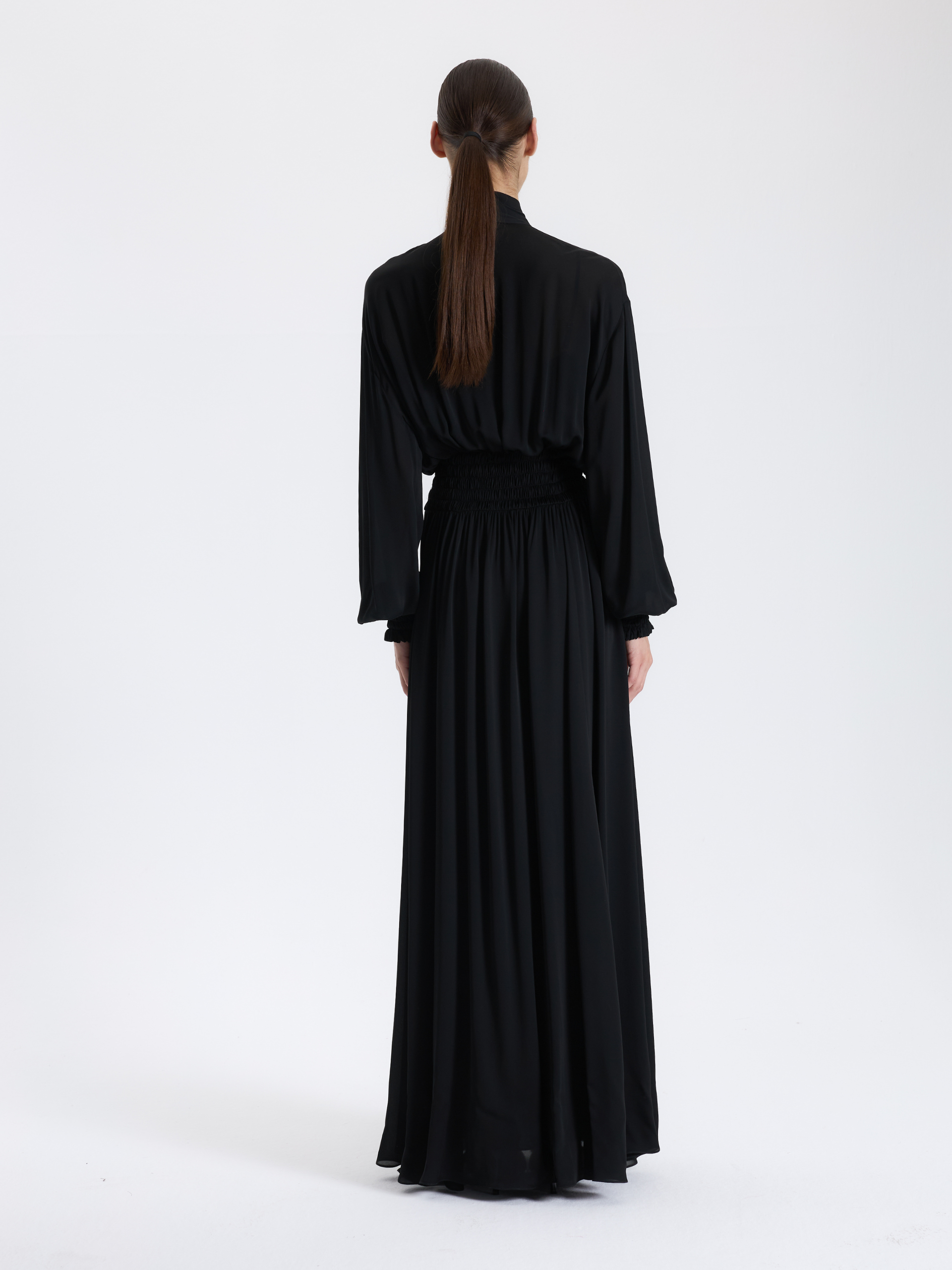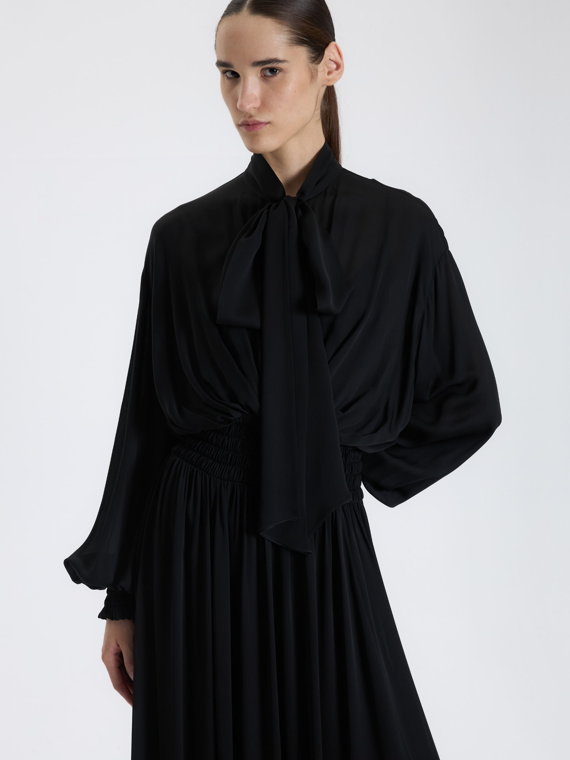 Kuşak detayı ve drapeli üst tasarımıyla feminen bir görünüm kazandıran siyah elbise.
