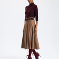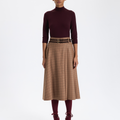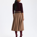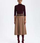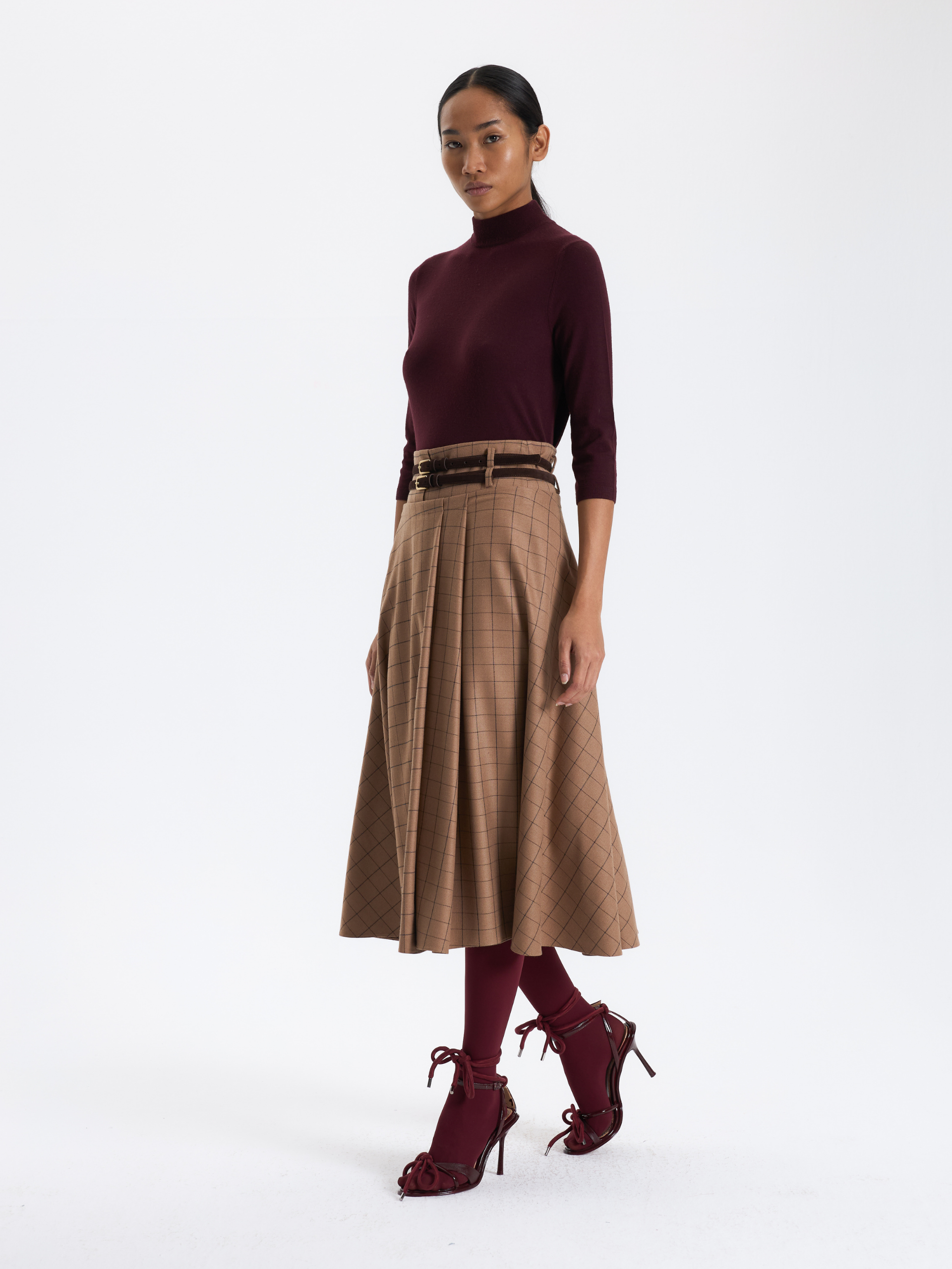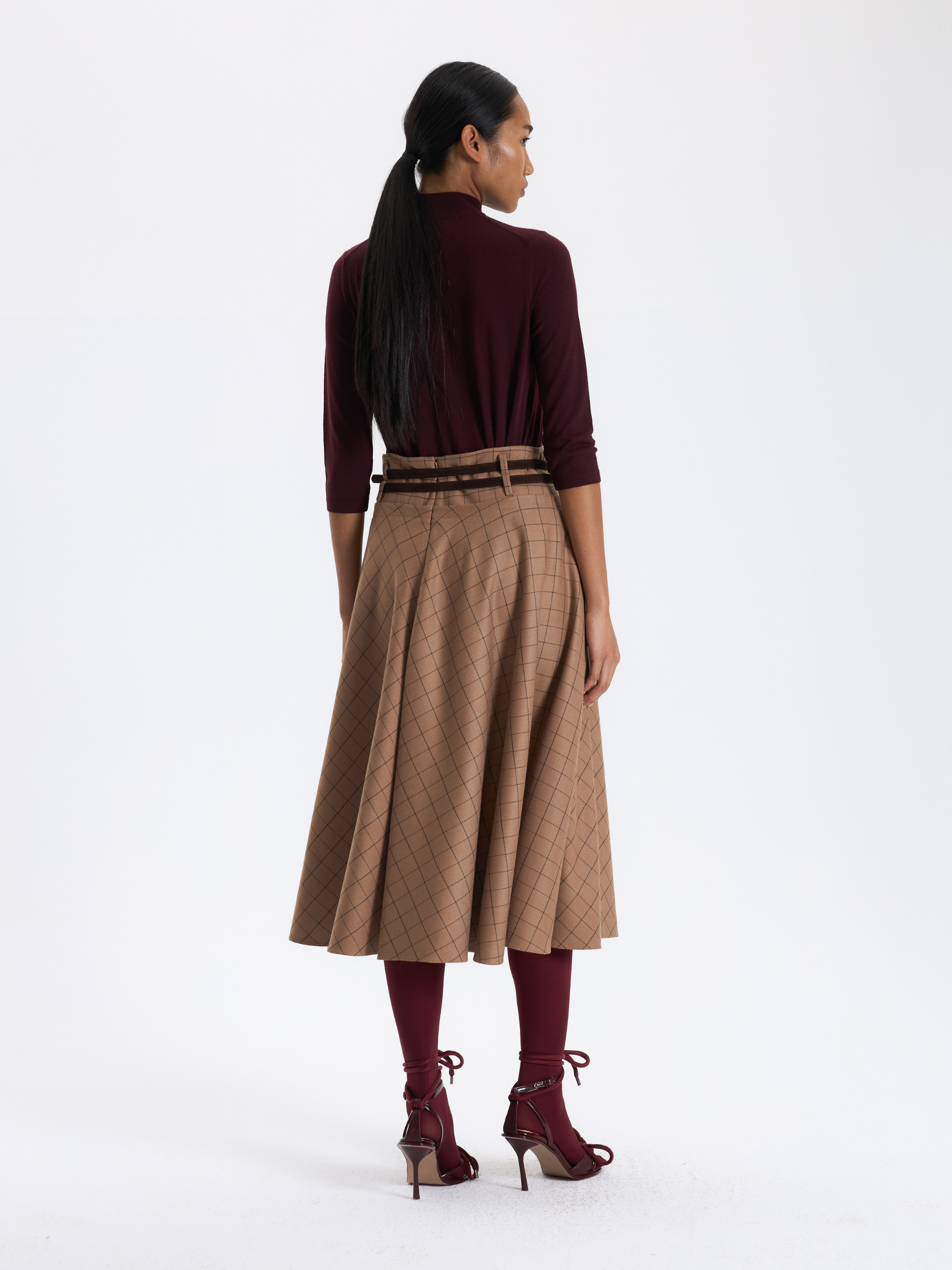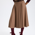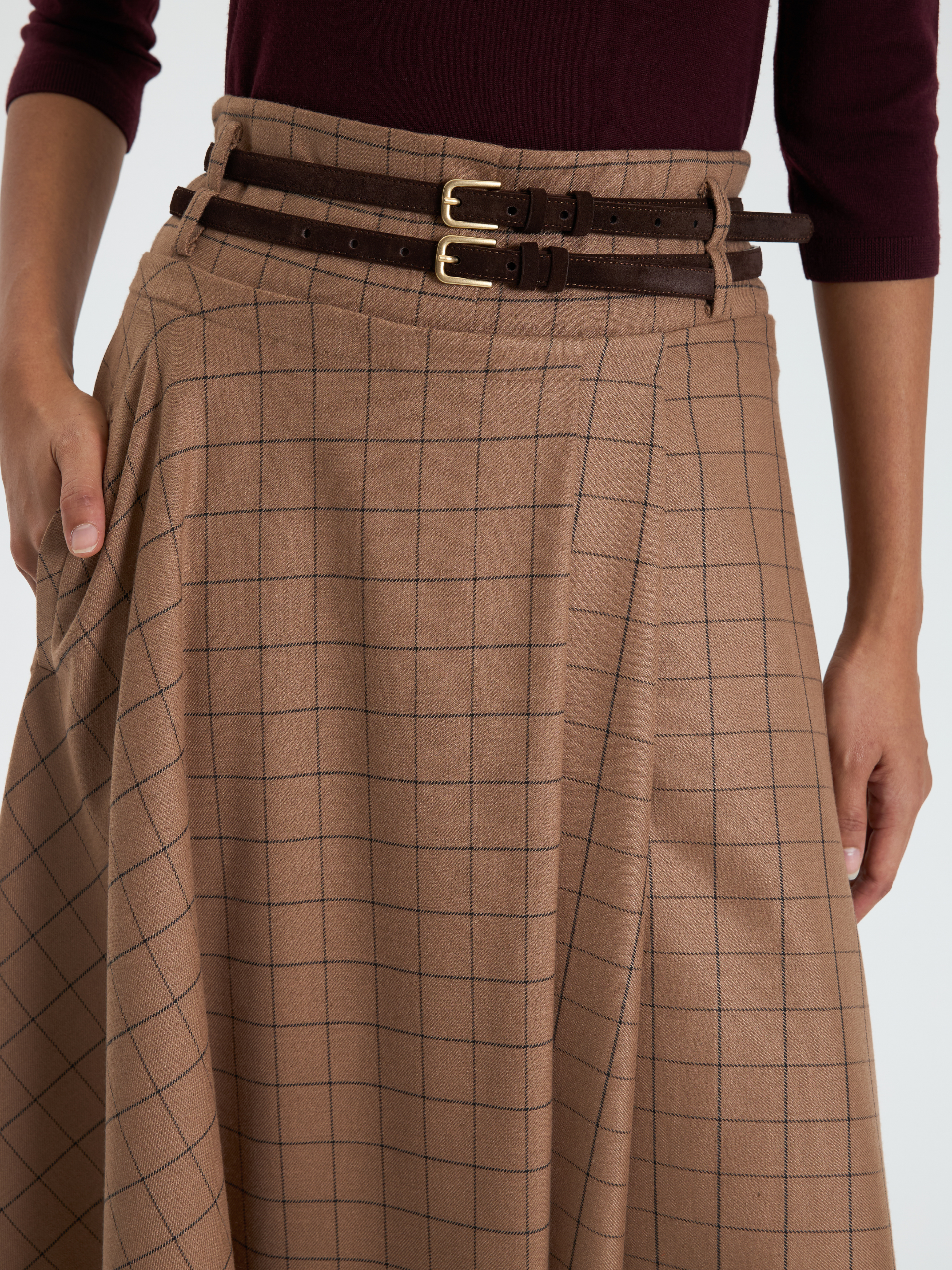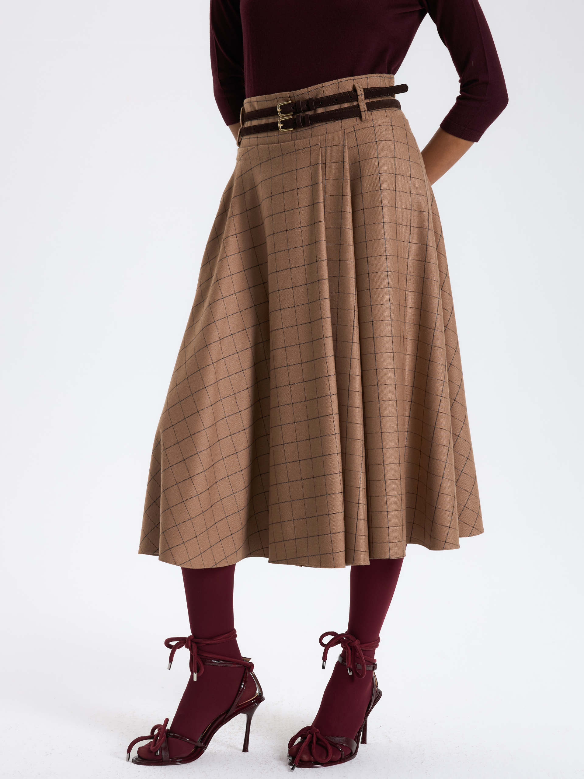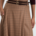 Ekose deseni ve çift kuşak detayıyla klasik bir şıklık sunan A kesim etek, zamansız bir seçim.