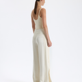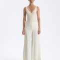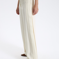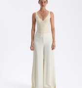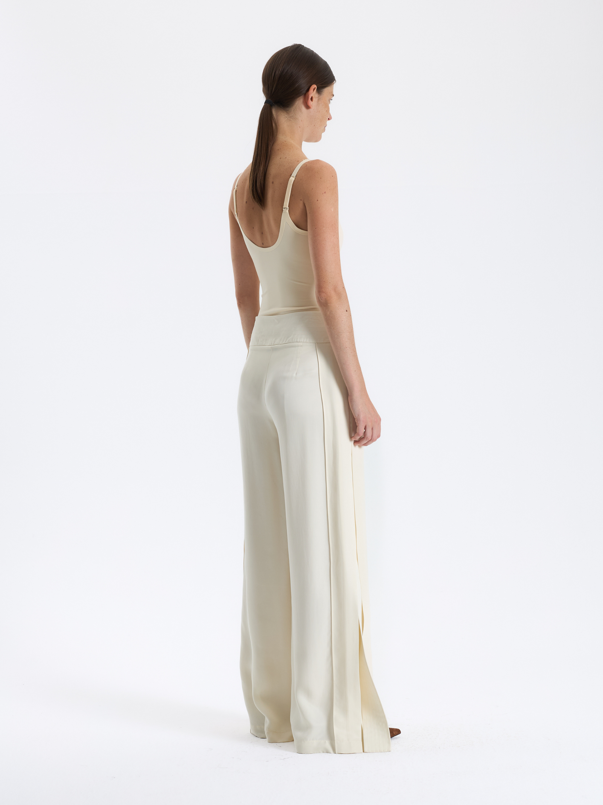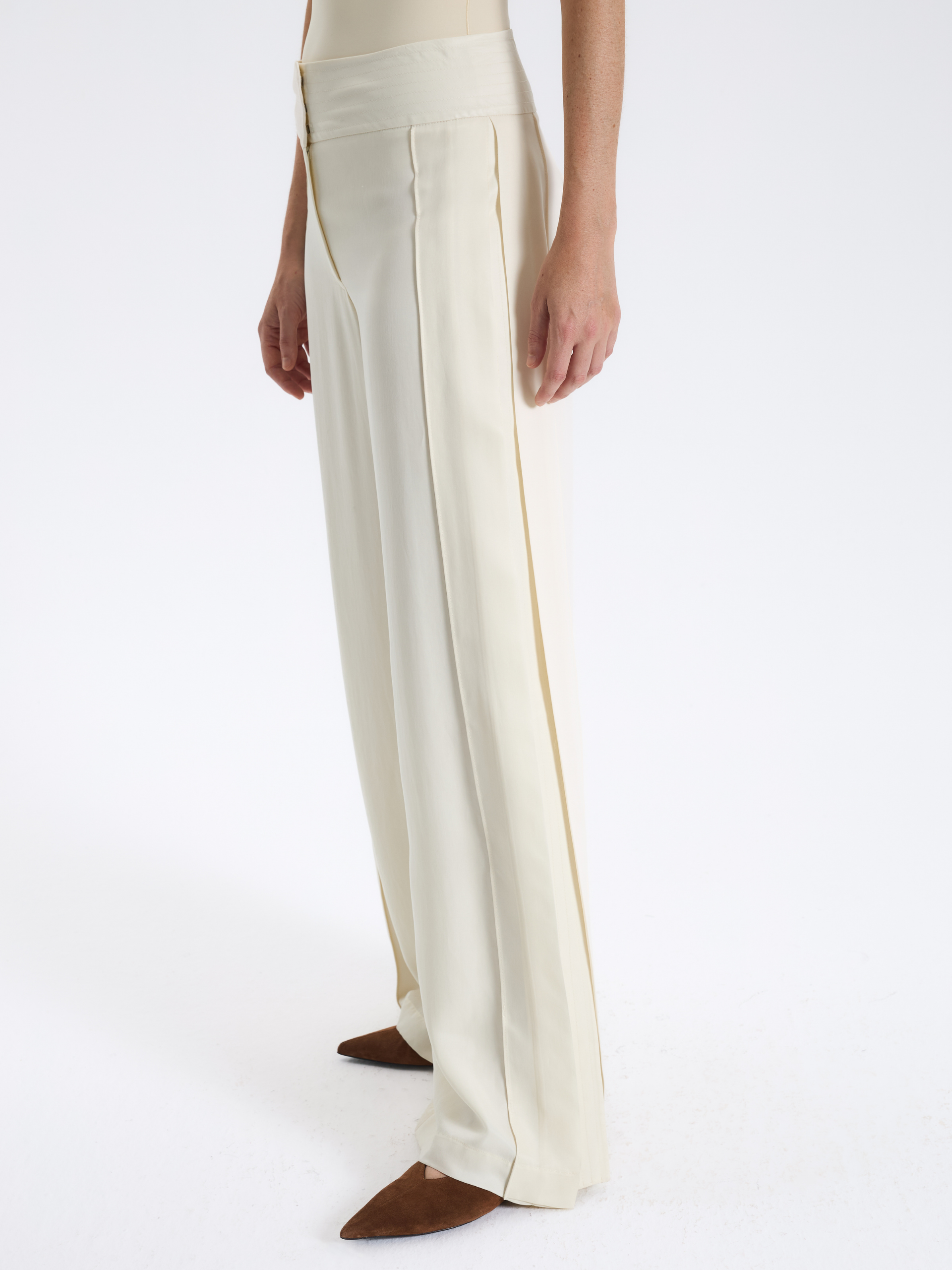 Akıcı kesimiyle öne çıkan ekru bol paça pantolon, sofistike ve zamansız bir görünüm sunuyor.